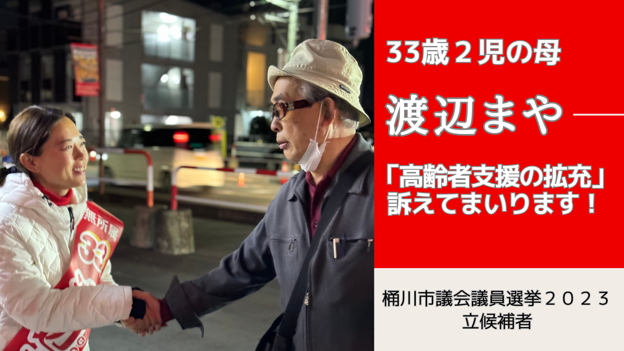 ホーム>政党・政治家>渡辺 まや (ワタナベ マヤ)>【桶川市議会議員選挙2023候補者公約一覧】「高齢者支援の拡充」訴えてまいります!