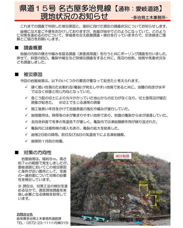 県道15号名古屋多治見線(通称:愛岐道路)の現地状況について、多治見土木事務所よりお知らせがありました。