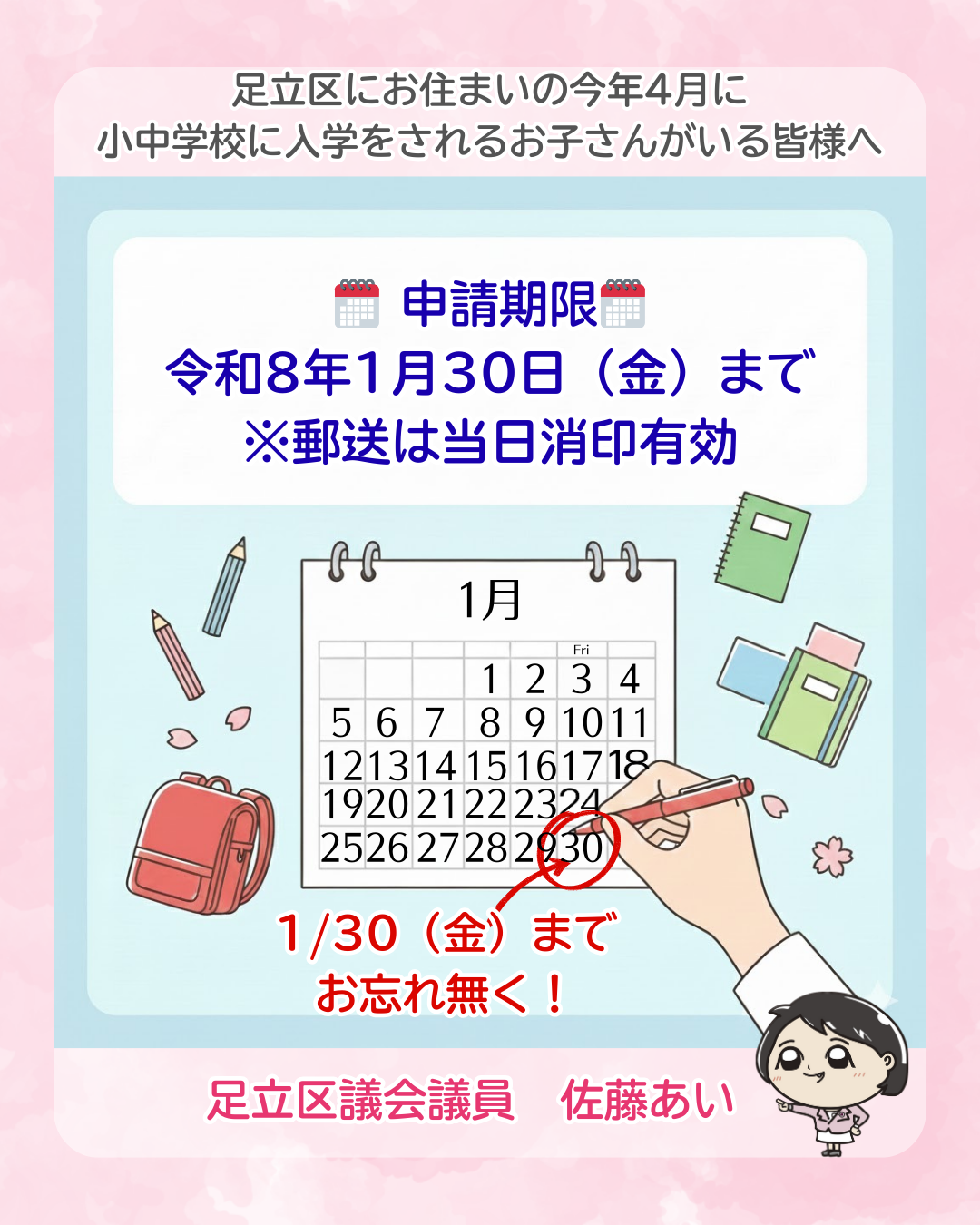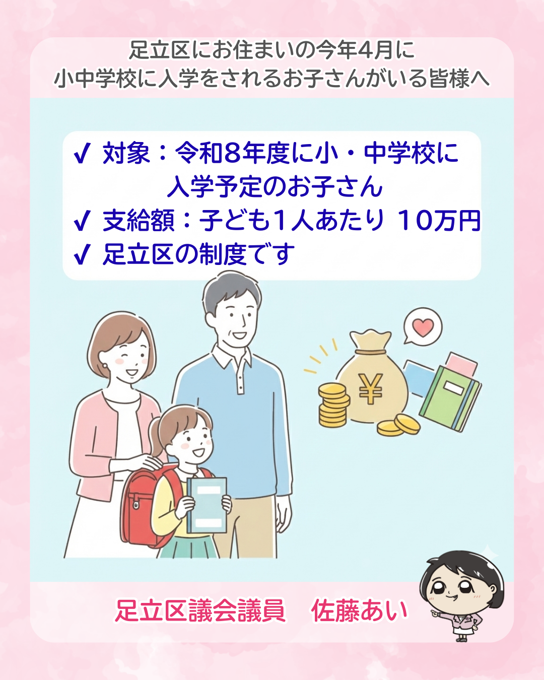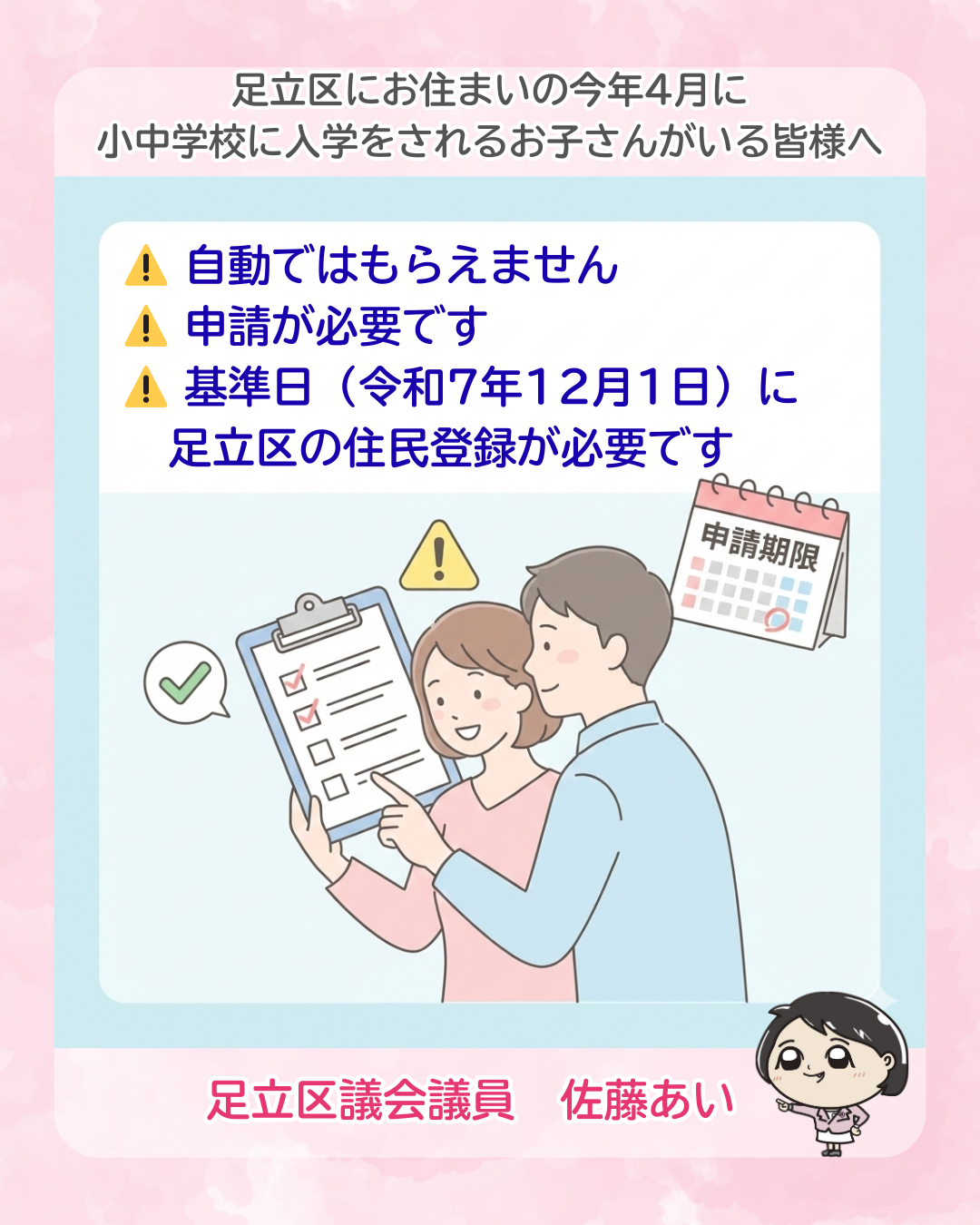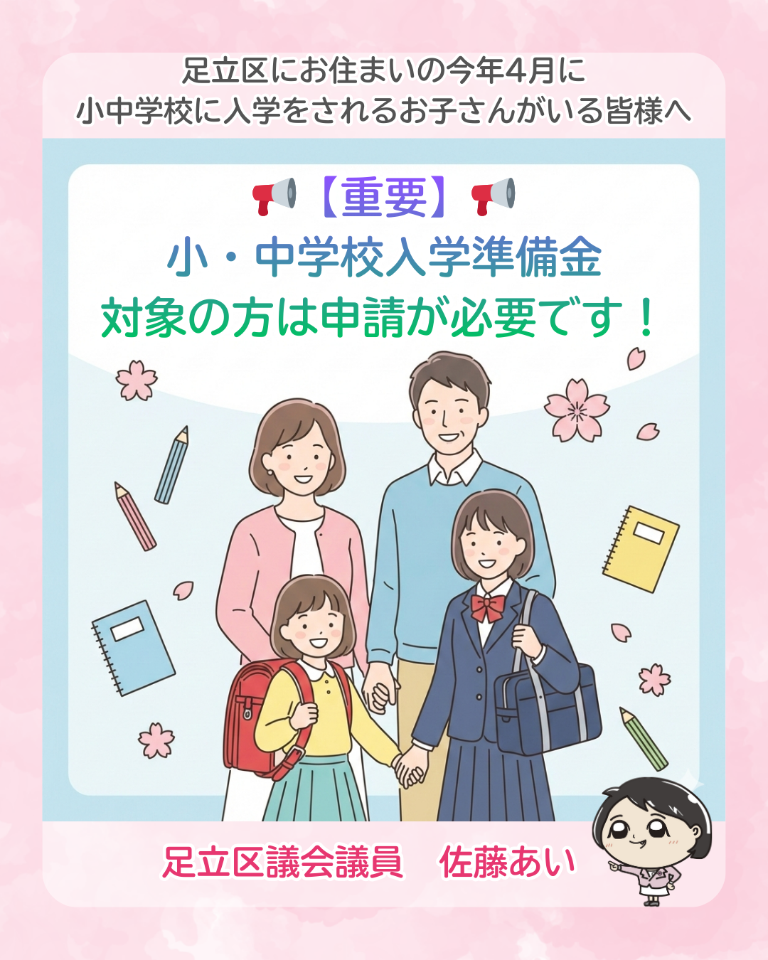 ホーム>政党・政治家>佐藤 あい (サトウ アイ)>【足立区】入学準備金の申請を忘れずに!