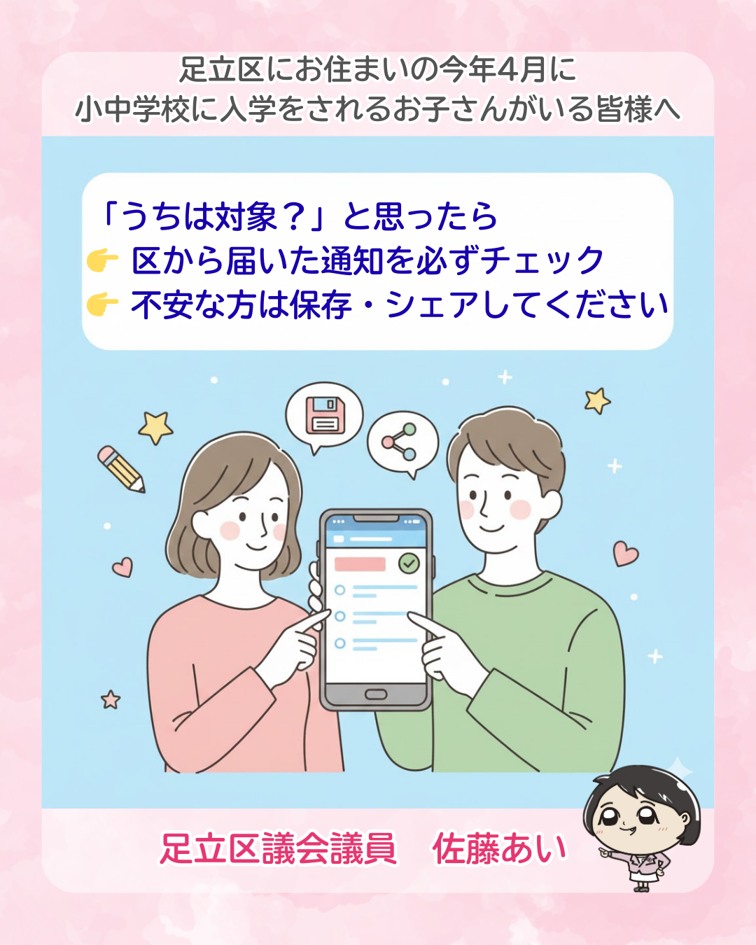 今年4月に小学校・中学校へ入学されるお子さんがいる足立区のご家庭へ、大切なお知らせです。