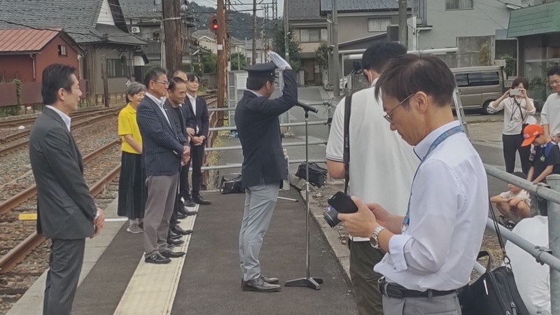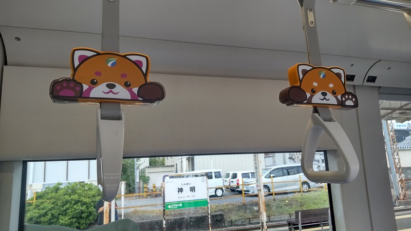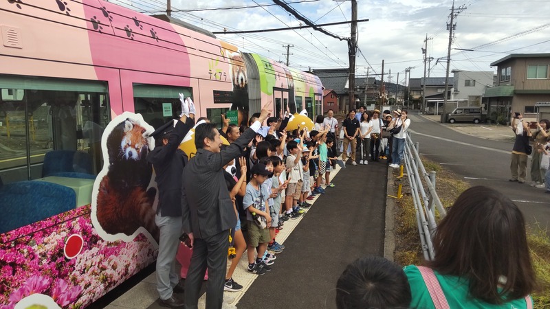 【レッサーパンダラッピング電車 お披露目式】 子供たちが大喜びで貸切ツアーに参加してました✨ 佐々木市長が1日駅長として「出発進行!」の合図👉 吊革もレッサーパンダだよ🎵