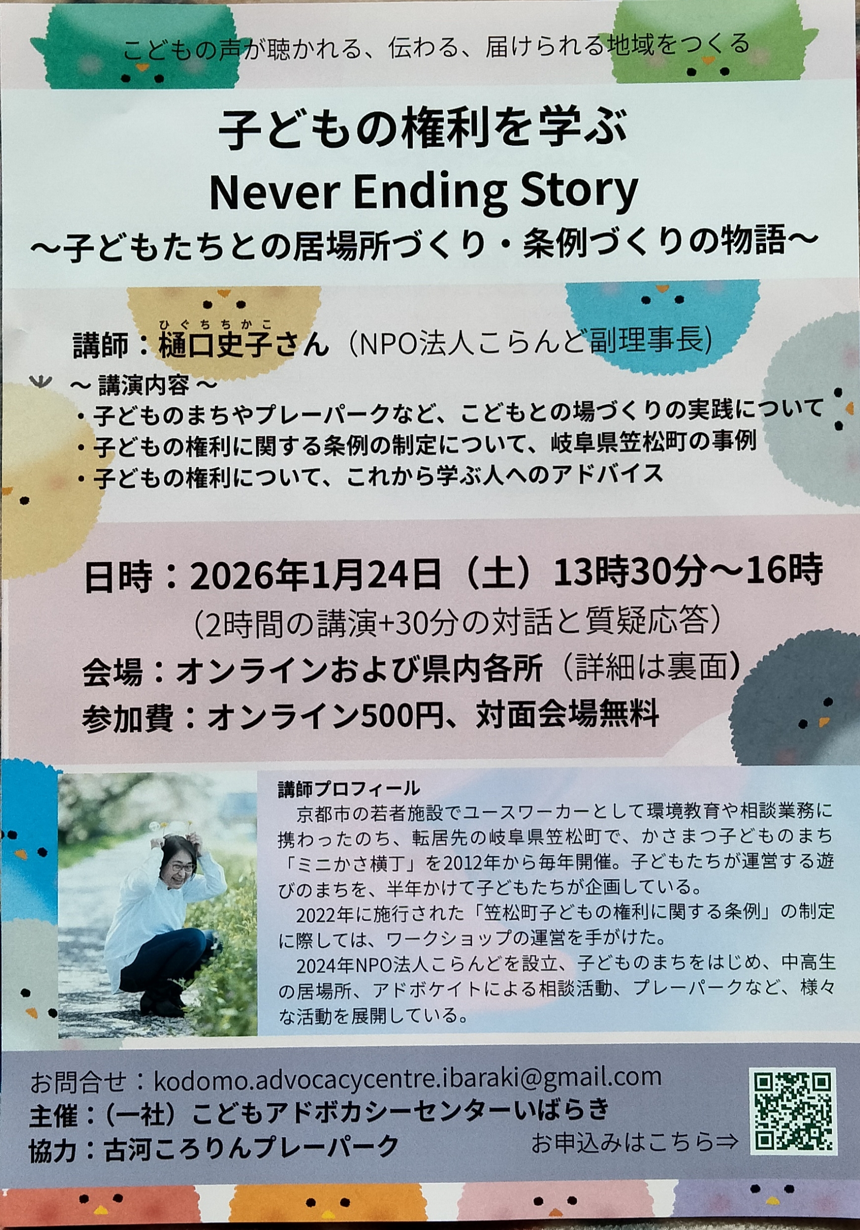先日1/17には「子どもにどこまで任せていいの?」「子どもの権利って、具体的にどう守ればいい?」そんな問いへのヒントが詰まった「子どもの権利を学ぶ」勉強会が開催されました。 ZOOMオンライン開催ではありますが、古河市、水戸市、つくば市、潮来市の4会場にも熱心な参加者が集まりました。私が参加した古河会場は特別養護老人ホーム白英荘 雅ホールで開催されました。講師は、岐阜県笠松町を拠点に活動するNPO法人こらんど副代表の樋口史子(ちかこ)さんです。18歳から若者の居場所づくりや地域参加などを通し、現場に立ち続けてきた樋口さんの言葉には、子どもたちへの深い信頼が溢れていました。