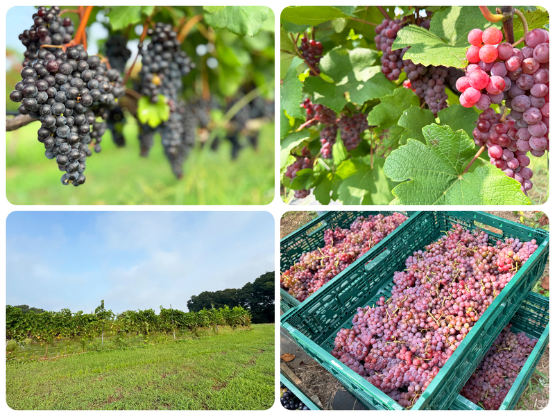 今日は、世界的にも有名な赤ワイン用ぶどう品種である「メルロー」、「タナ」、そして日本では食用ぶどうで有名な「デラウェア」の3種を収穫しました。