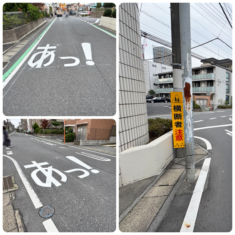 ところで皆さんは「あっ!」の路面標示による事故激減効果をご存じでしょうか? こちらは神奈川県川崎市から始まった取り組みで、現在柏市でも複数個所で採用されていますが、川崎市によれば【設置前の5年間で16件あった事故が設置後の3年間でわずか1件に激減した】事例もあるという事で効果が期待できます。