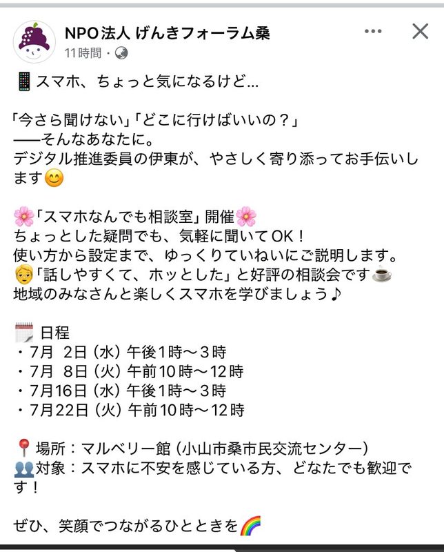 🌼げんきフォーラム桑🌼様主催のスマホ相談室開催のお知らせ📱 今度は私もお邪魔させて頂きます🙇♀️