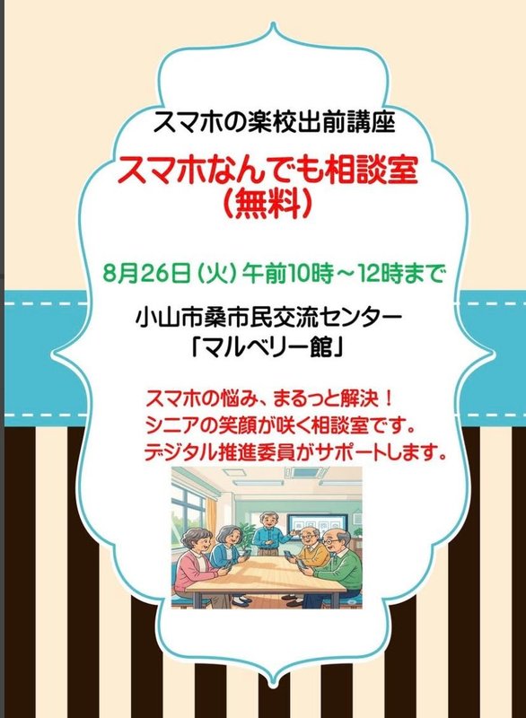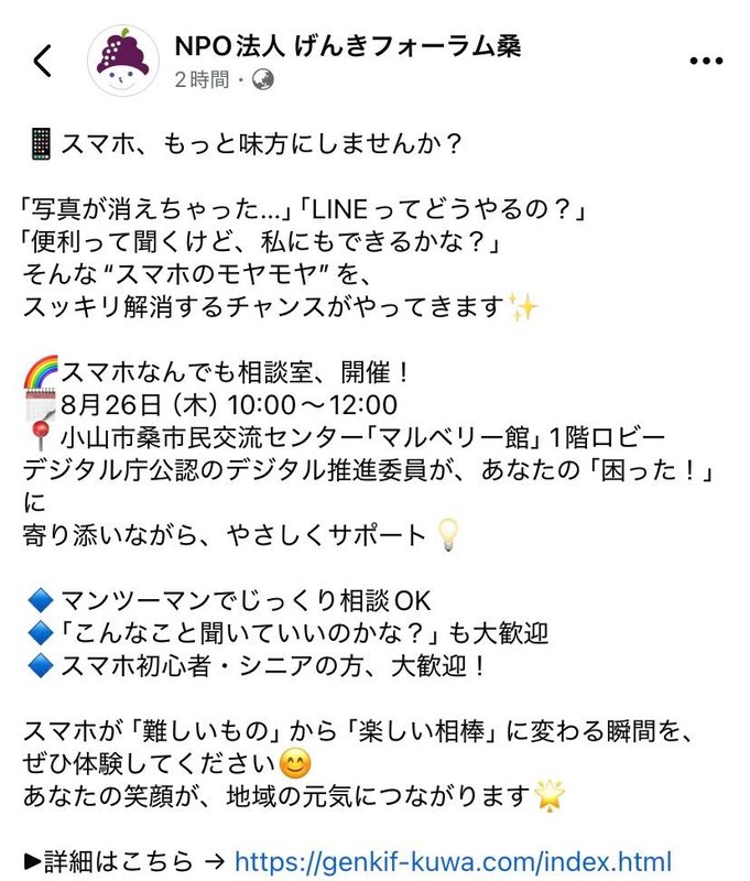 元気フォーラム桑さまより、スマホ教室のご案内です