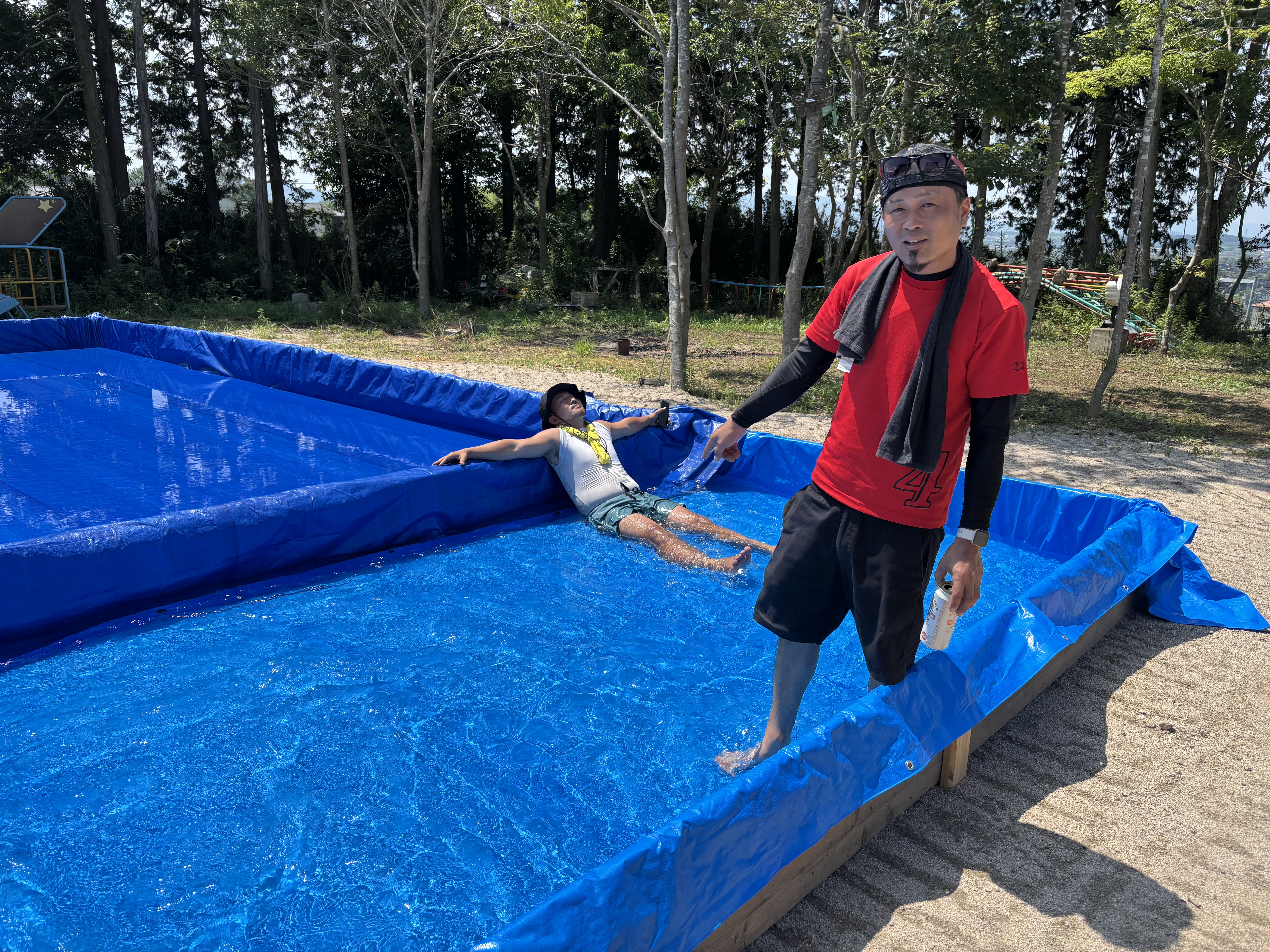 9時にキャトルメンバーで集合し、手分けして看板設置、食材確認、屋台や縁日の設営、プールの水入れなどをしました。