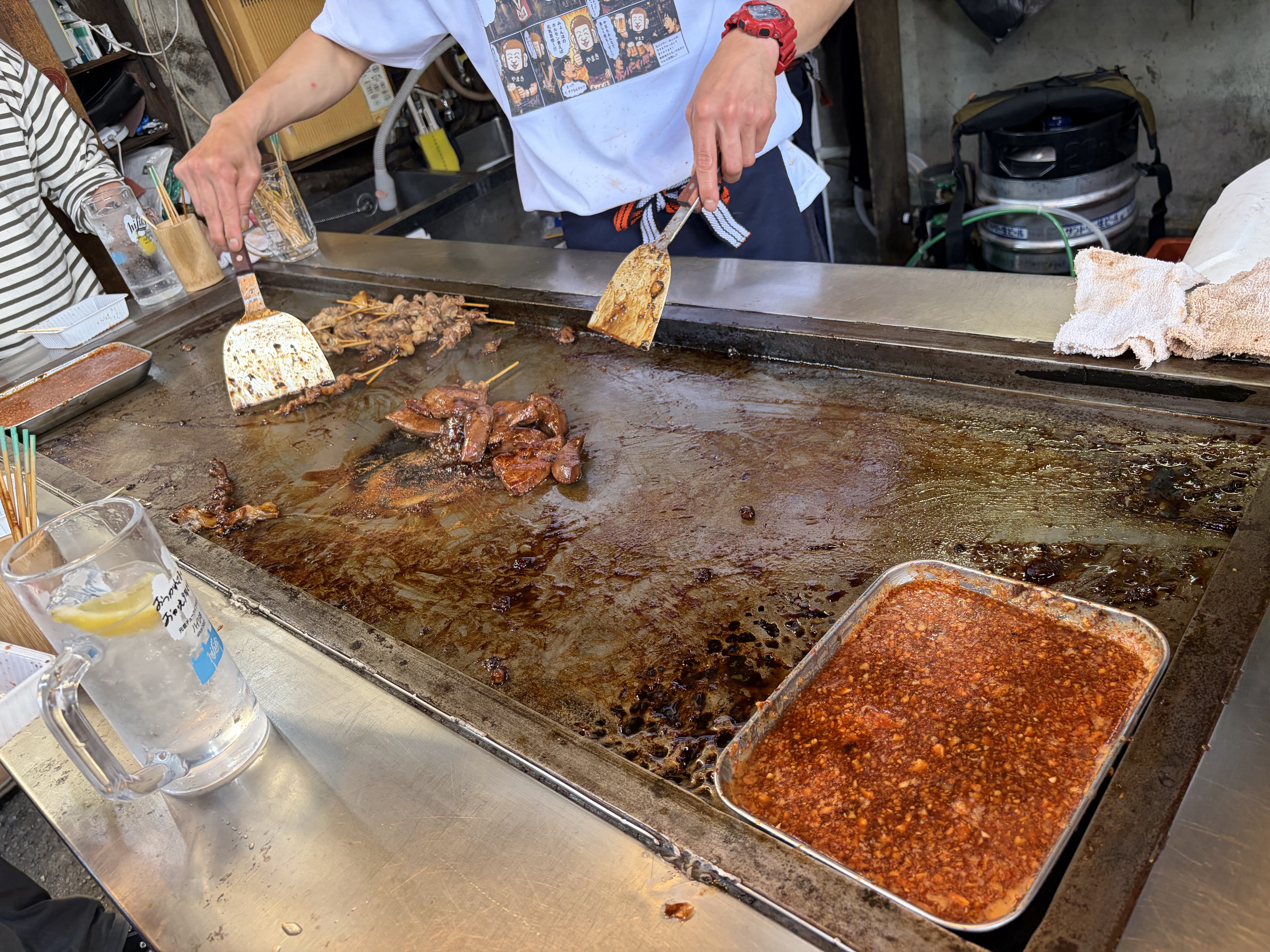 鉄板で焼いたホルモンをニンニクたっぷりのタレへ潜らせて食べるのですが、ここにあるハイリキというアルコールとの相性は絶品でした👍