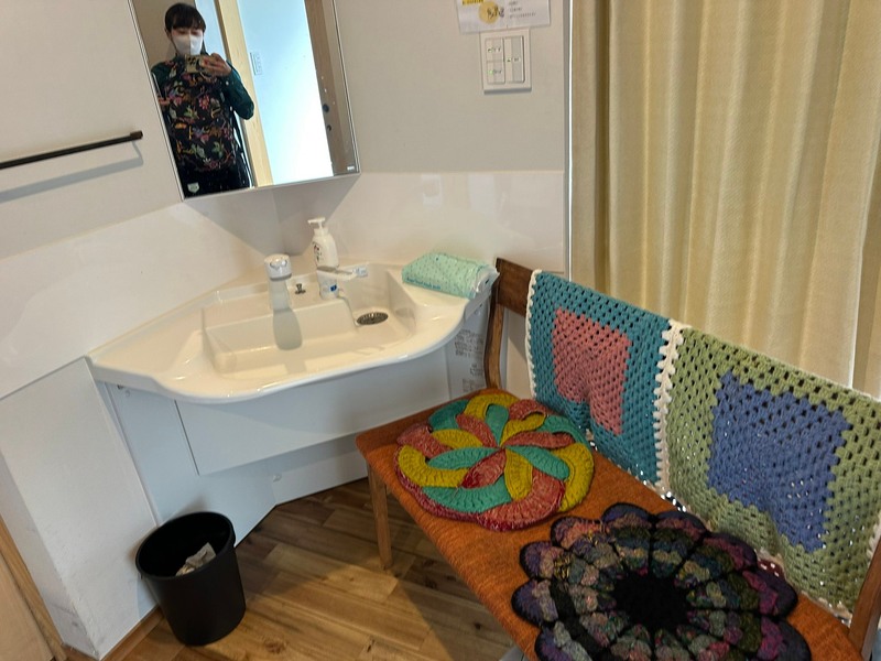 実際グループホーム唯の中を見せていただくと、利用者さんが食材をおとなりさんから持って帰ってきました。またお昼ご飯のごますりなどをされており、心地よい音がしました。建物の柱がログハウスのようで大きな木材が張り出しており、そこまでバリアフリーでないその環境に落ち着きを感じました。作られた無機質の場所より住んでいた住居に近い場所がとても良いと思いました。