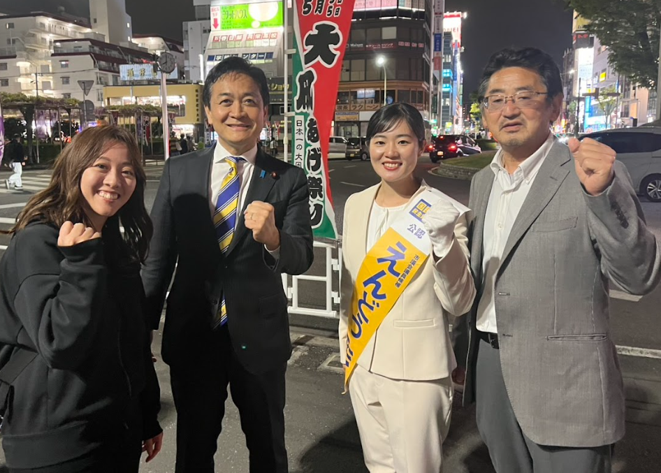 左から)近本あんな、玉木雄一郎 国民民主党代表、えんどう彩生候補、黒澤三千夫熊谷市議