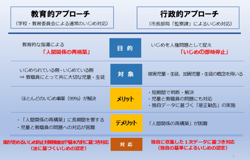 教育委員会とは別の、市長部局に、危機管理部監察課を設置。教育委員会とは協力関係になく、監察課が独自に調査・解決に導く。