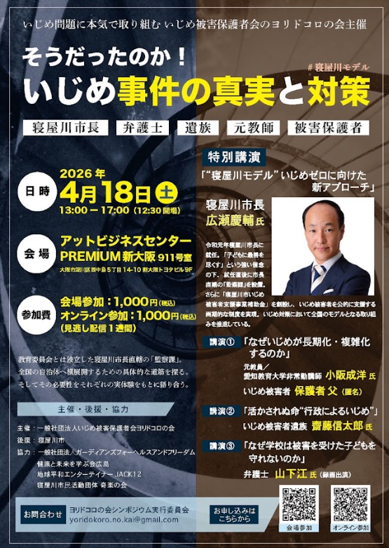 4月18日、ヨリドコロの会のシンポジウム「いじめ事件の真実と対策」の講演。講師は、寝屋川モデルを提唱する寝屋川市長・広瀬慶輔さん。