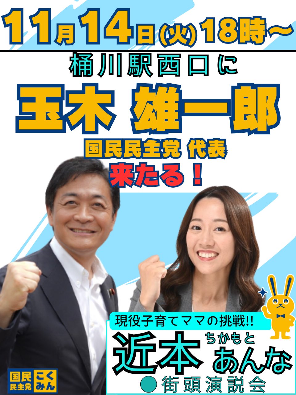ホーム>政党・政治家>近本 あんな (チカモト アンナ)>【桶川市議会議員選挙】本日!国民民主党の玉木雄一郎代表が桶川にきます!