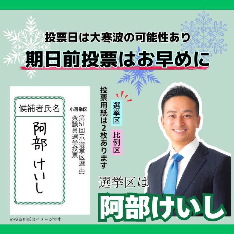 ホーム>政党・政治家>阿部 けいし (アベ ケイシ)>期日前投票はお早めに!投票日の2/8(日)は寒波到来の予報となっております。