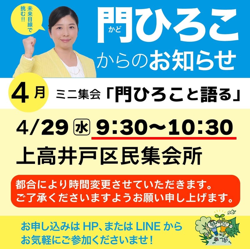 ホーム>政党・政治家>門 ひろこ (カド ヒロコ)><東京8区>門ひろこ通信4月27日(日)【📢上高井戸ミニ集会 お時間の前倒し変更のお知らせ】4...