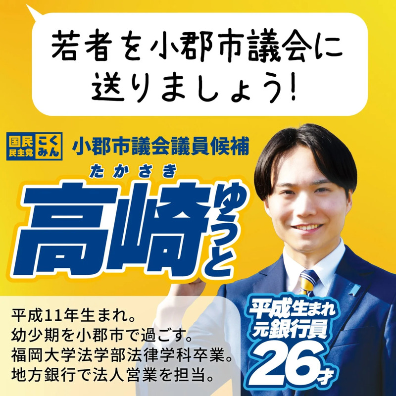 福岡・小郡市議会議員選挙で、国民民主党公認の#高崎ゆうとが当選いたしました。