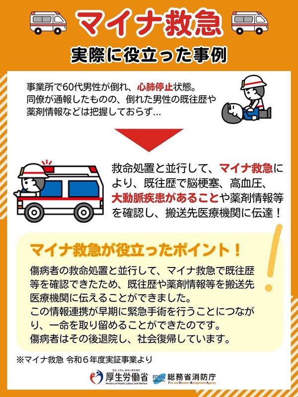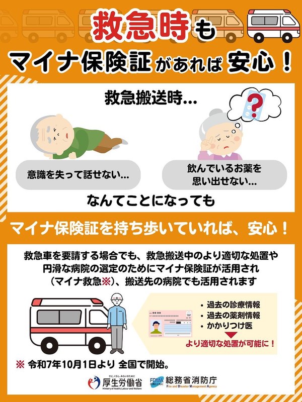 10/1から県南西部消防局でもマイナ保険証を活用した「マイナ救急」の実証実験が始まっています。もしもの時に備えて、是非紐付けをお願いいたします。