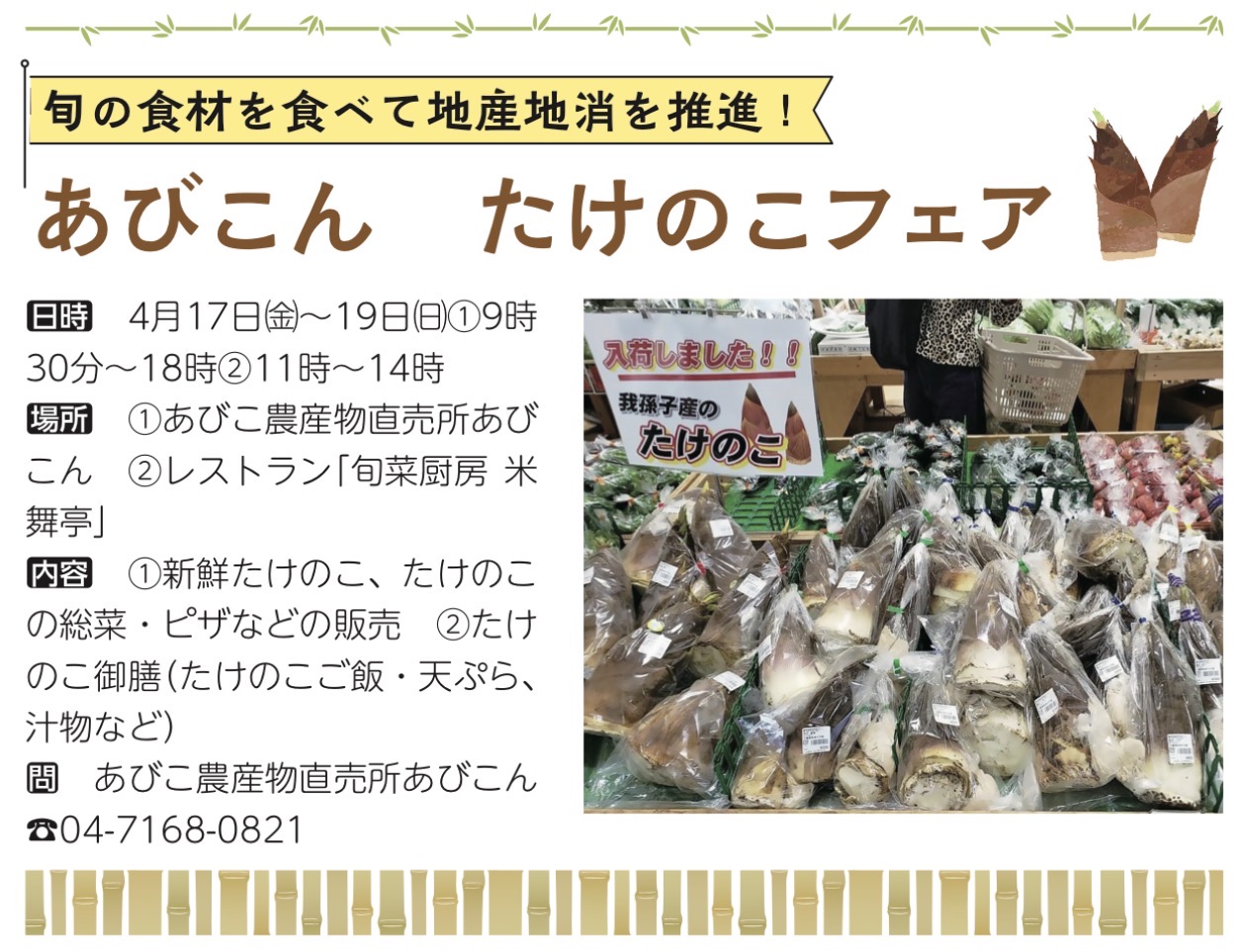 たけのこフェアが開催されるんだ。 『あびこん たけのこフェア』について説明するね。 |