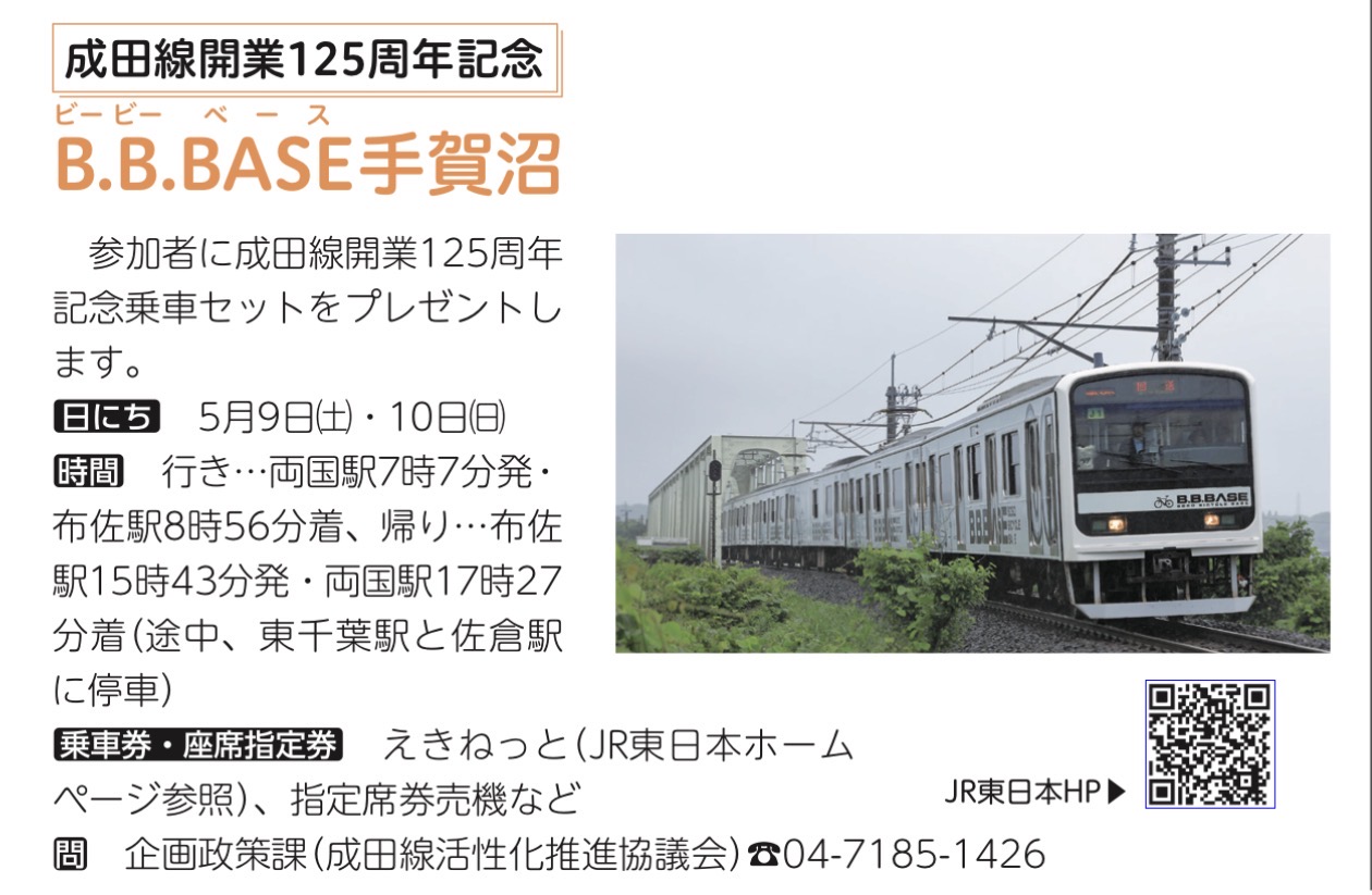 成田線開業125周年記念品もあるんだ。 『運行決定!特別記念列車 「B.B.BASE手賀沼」』について説明するね。 |