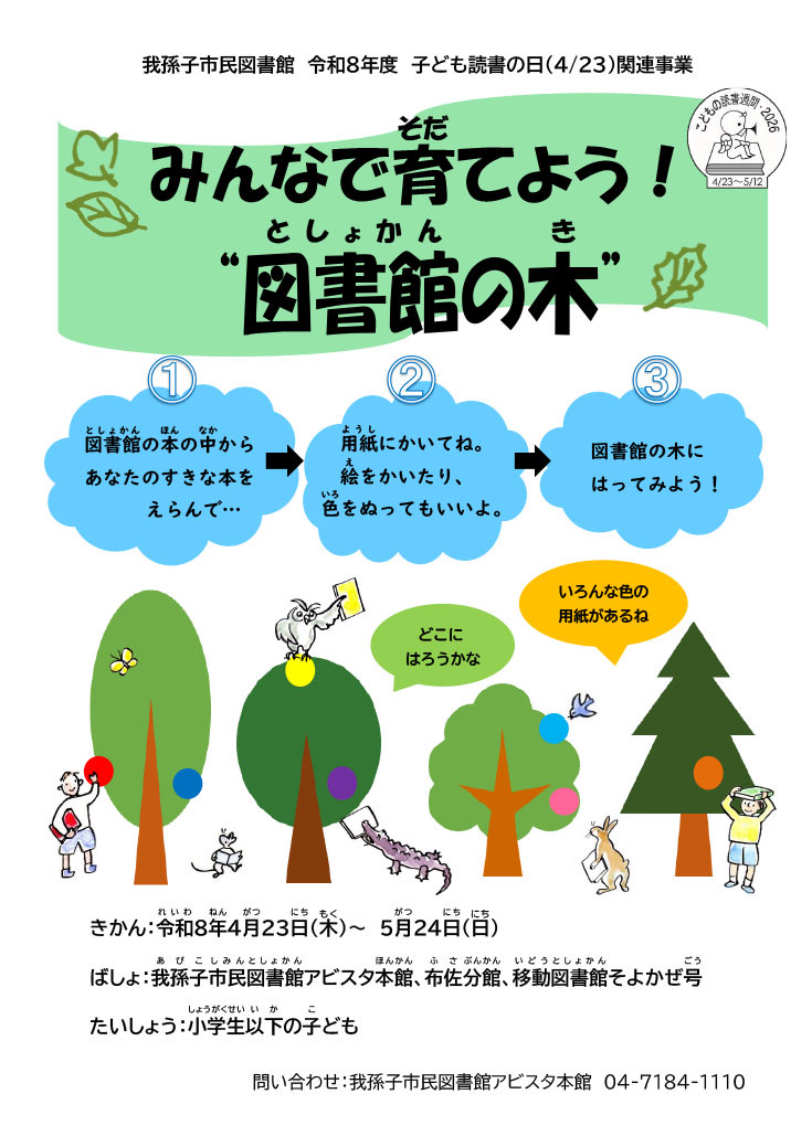 4月23日の「子ども読書の日」に合わせて、図書館で「図書館の木」という素晴らしいイベントが始まります。読書は子どもたちの想像力を豊かにし、語彙力や思考力の土台を作る非常に大切な活動です。このような機会を通じて、多くの子どもたちが本に親しんでくれることを願っています。