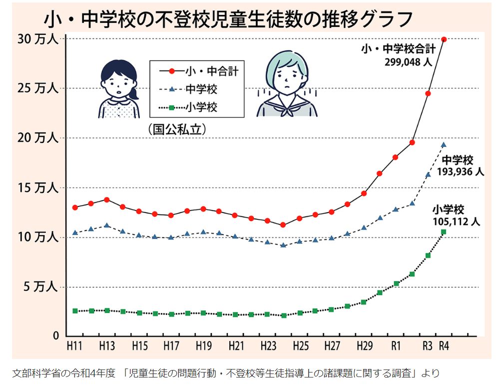 文部科学省が11月に発表した令和4年度の不登校の児童・生徒数はおよそ29万9千人で、10年連続で過去最多を更新しています。そして、この2年間で一気に10万人が増えています。