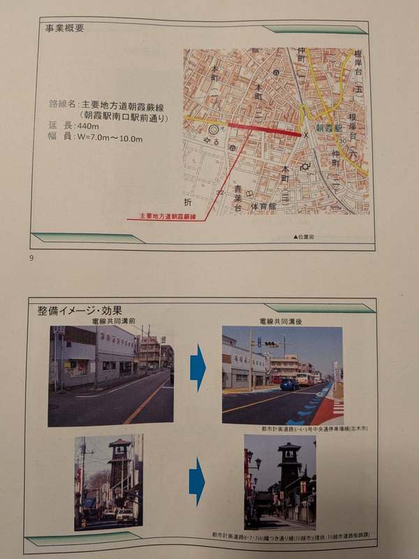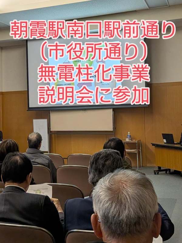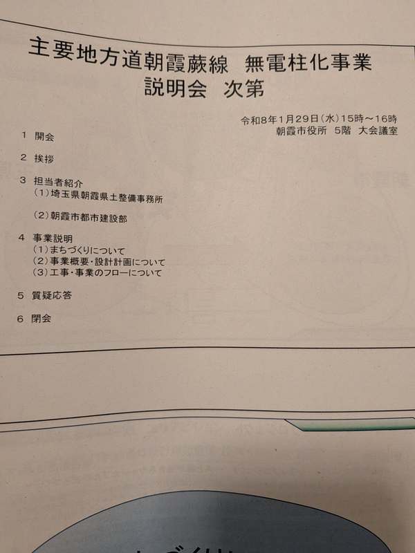 朝霞駅南口駅前通り(市役所通り)の無電柱化事業説明会に参加、令和15年に完成予定!(pic2のスケジュール参照)