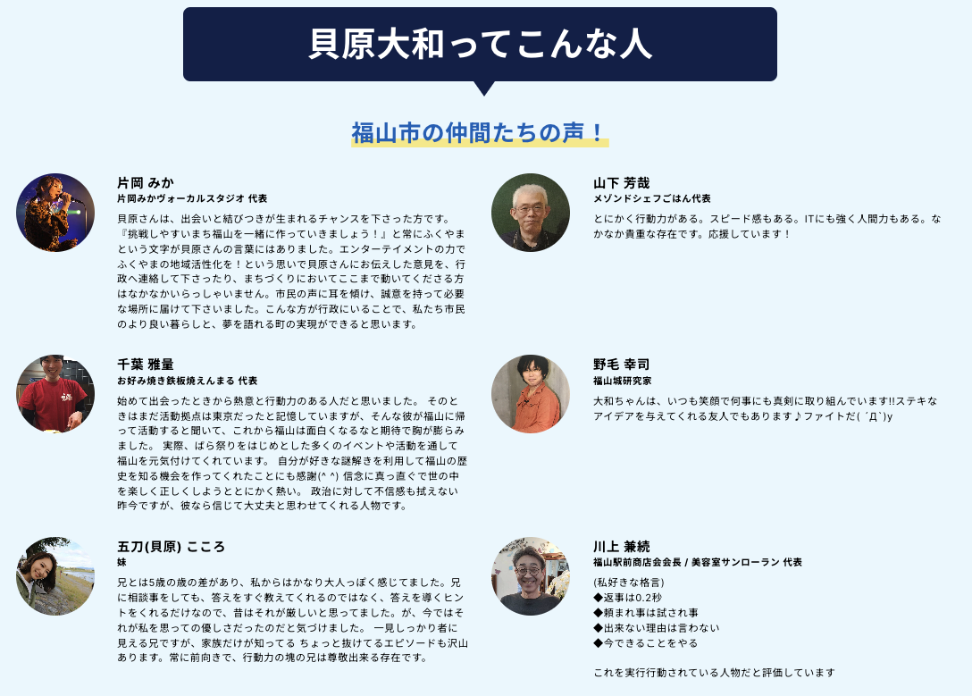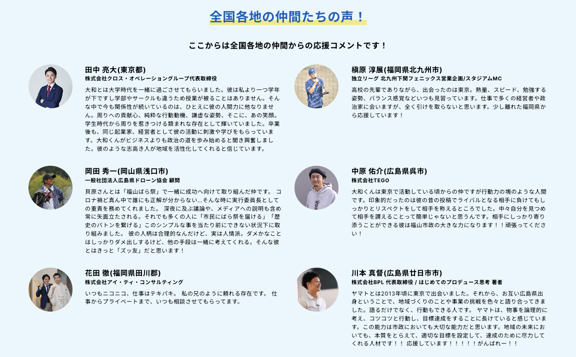 特に力を入れているのは、福山市に戻ってきてから共に多くの活動をしてきた仲間からの紹介コメントです。