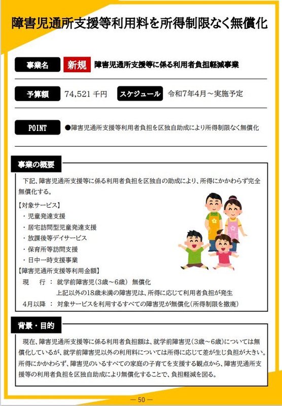 障害児通所支援の無償化は、現時点では千代田区、中央区に続く3自治体め。