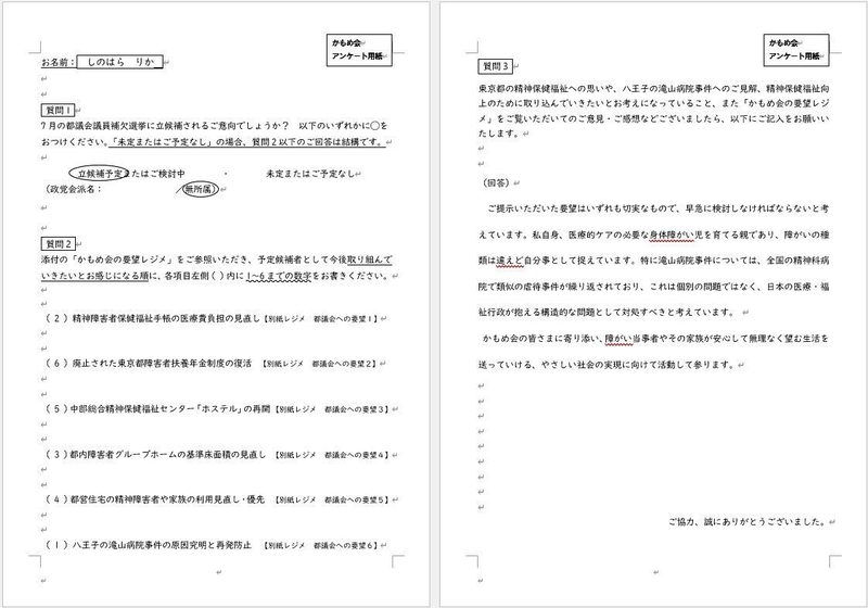 ホーム>政党・政治家>しのはら りか (シノハラ リカ)>【品川区精神保健福祉家族会かもめ会様のアンケートに回答しました】さまざまなご要望を拝読させてい...