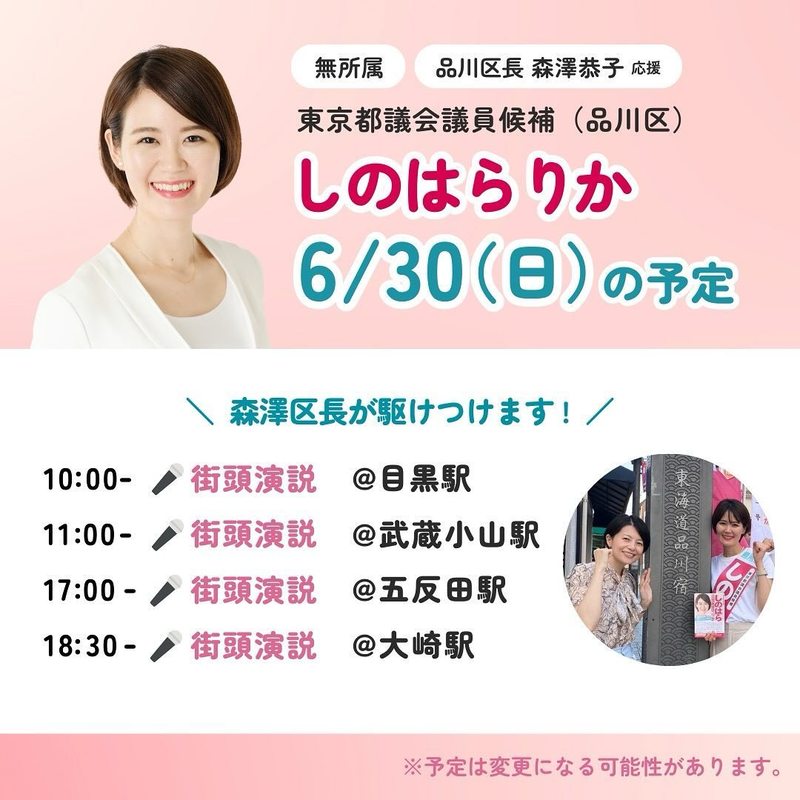 ホーム>政党・政治家>しのはら りか (シノハラ リカ)>6/30(日)選挙活動期間、唯一の日曜日には、品川区長森澤恭子さんが応援にかけつけてくださる予定です
