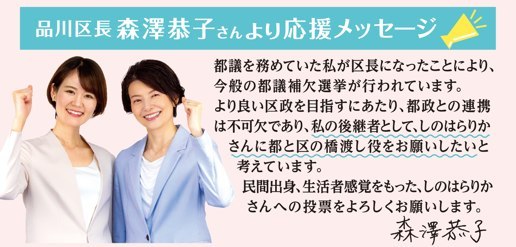 ホーム>政党・政治家>しのはら りか (シノハラ リカ)>【東京都議会議員補欠選挙/品川区】私が品川区長森澤恭子さんの後継として立候補した理由