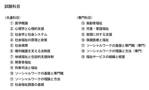 社会福祉士の試験科目は、精神保健福祉士との共通科目と、社会福祉士の専門科目である全19科目からなります。