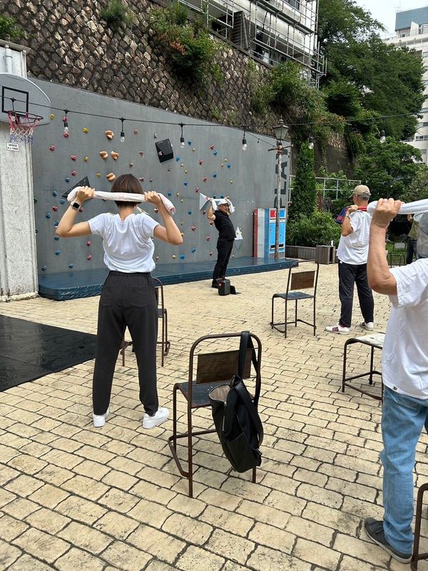 ラジオ体操で準備体操をしたあと、今日は櫻井先生のタオルエクササイズ。