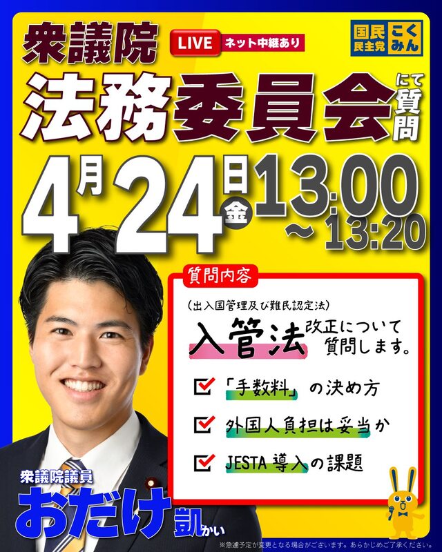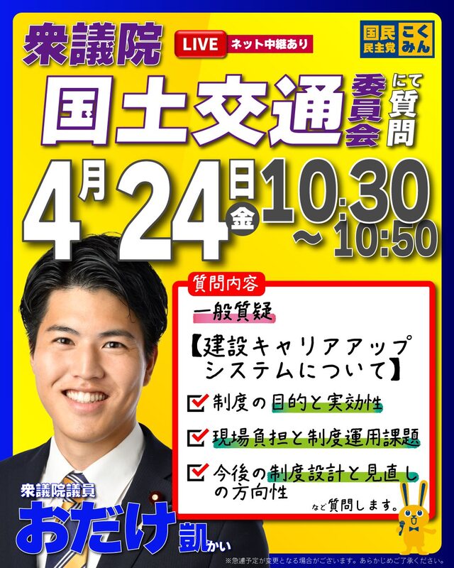 ホーム>政党・政治家>おだけ かい (オダケ カイ)>【国交委・法務委で質問します🙋】明日はダブルヘッダーです。