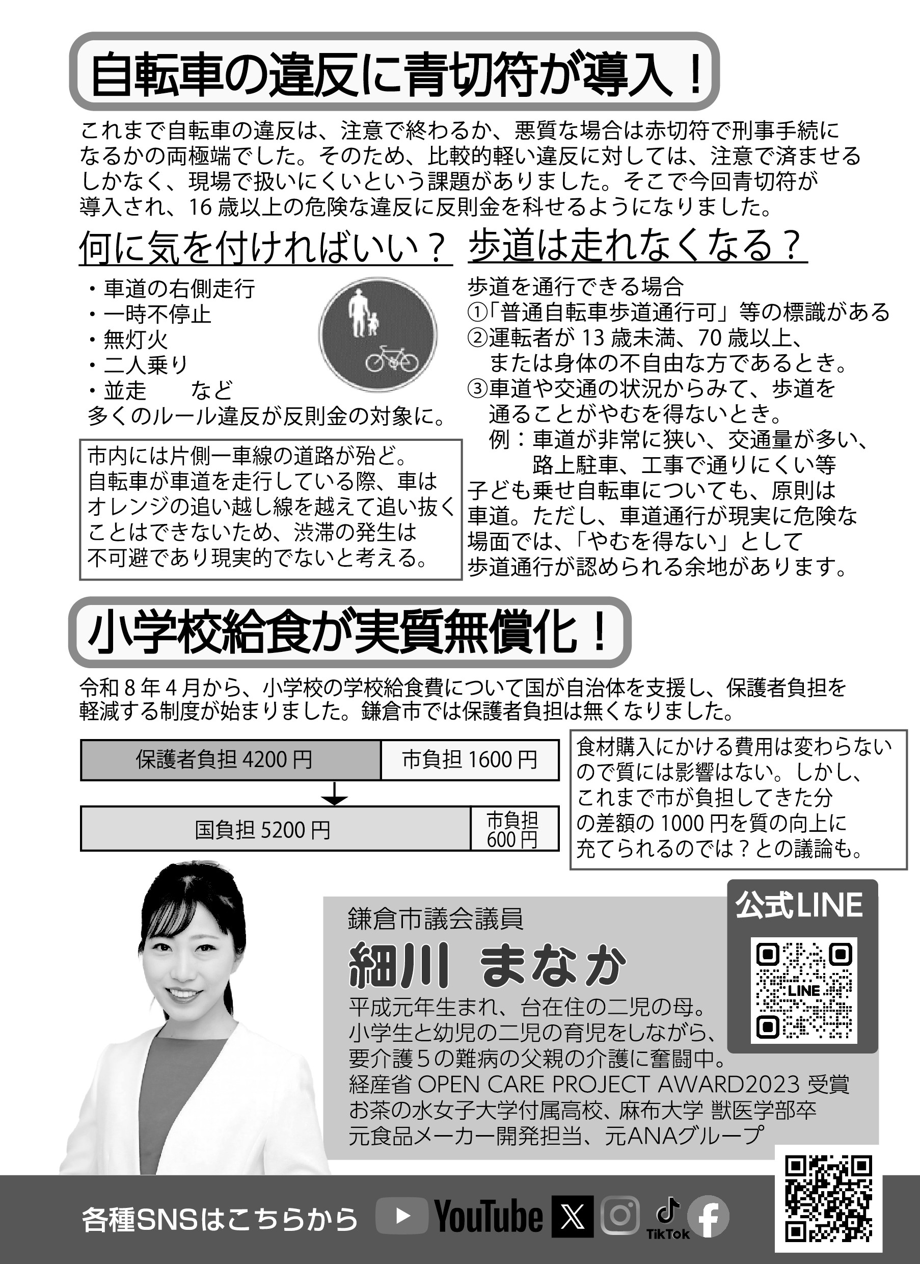 ホーム>政党・政治家>細川 まなか (ホソカワ マナカ)>北鎌倉駅から朝のレポート配布!育児と介護の二刀流!鎌倉市議会議員細川まなか