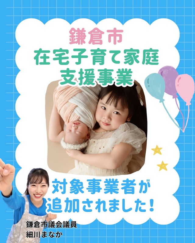 ホーム>政党・政治家>細川 まなか (ホソカワ マナカ)>鎌倉市在宅子育て家庭支援事業に対象事業者が追加されました!