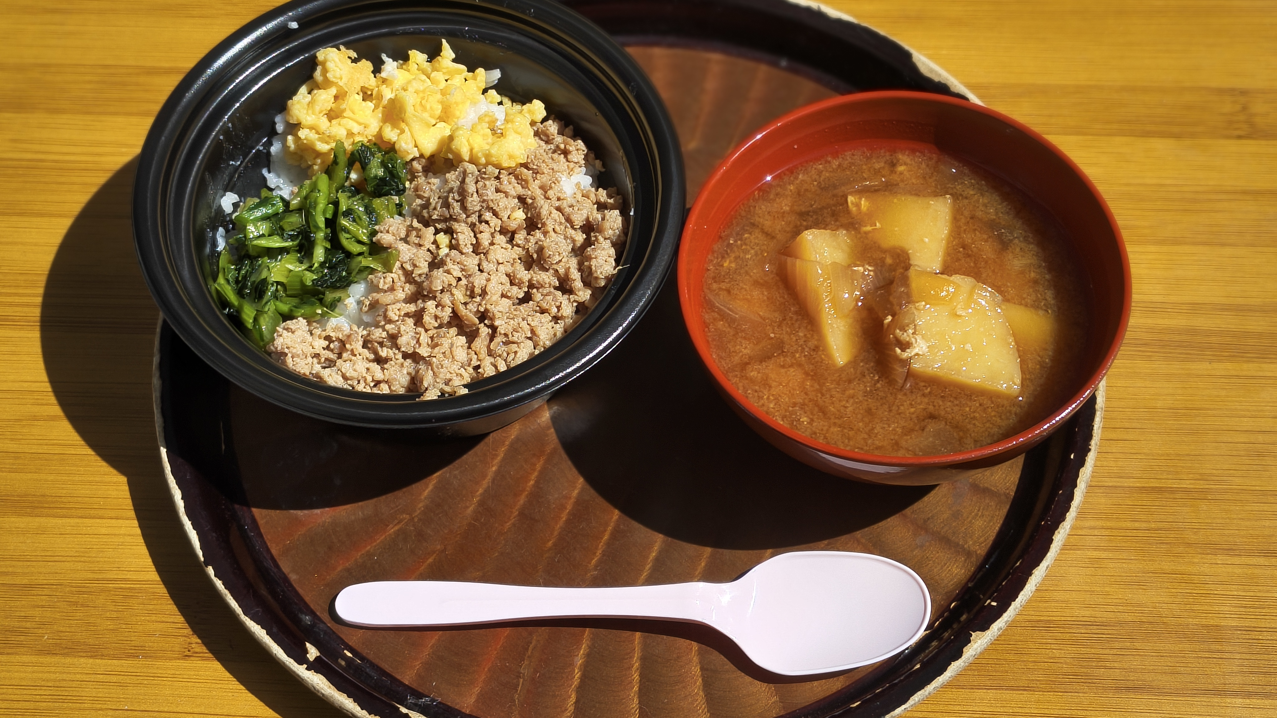 今回のえにち食堂は、彩り豊かな三色丼と具だくさんのお味噌汁を提供しました。