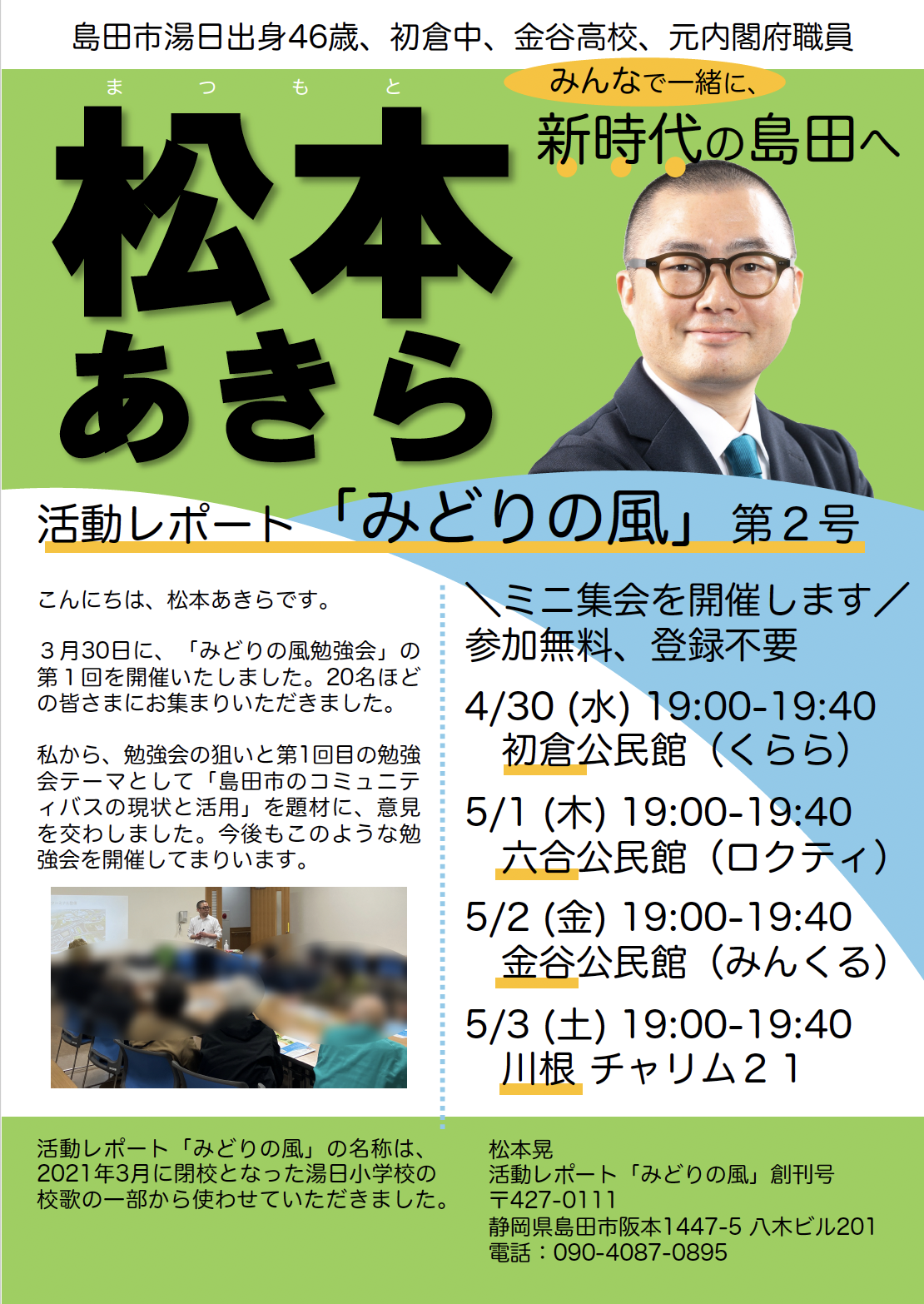 ホーム>政党・政治家>松本 あきら (マツモト アキラ)>\ミニ集会を開催/ 4/30初倉 5/1六合 5/2金谷 5/3川根