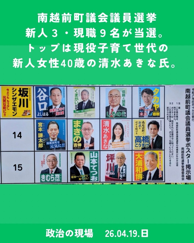 #政治の現場 🟢南越前町議会議員選挙、新人3名・現職9名が当選。トップは新人女性の清水あきな さん40歳。