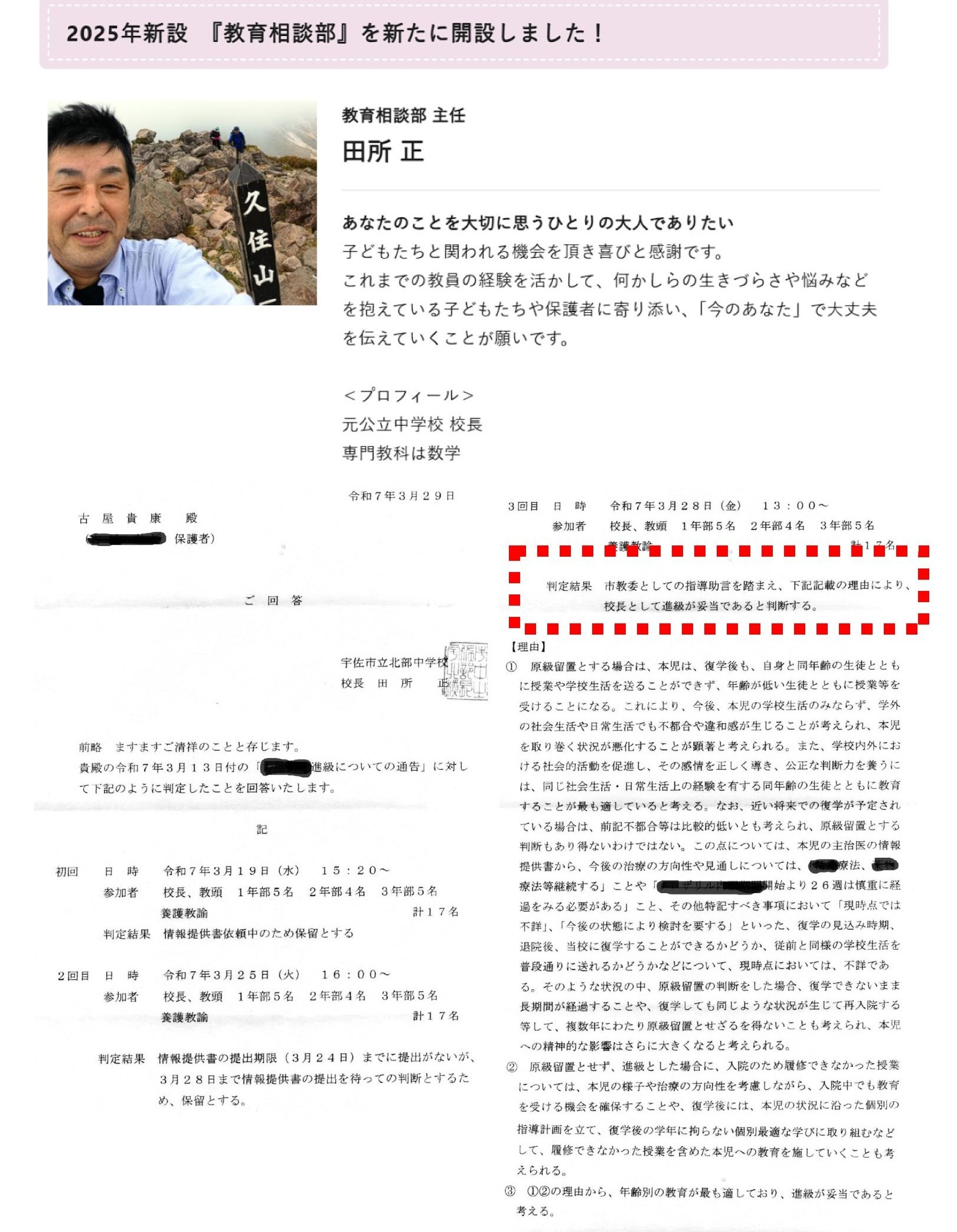 元宇佐市立北部中学校長 田所正さんのプロフィールを見つけた。彼は、現在の校長の前(射場校長)の前の校長(令和7年3月31日まで)である。「だれも理解・説明できない書類」を私に送り付け、郵便が届く前に退職していた。そして、退職金を受け取る権利を得て、夢の●に、主任として就職したようである。「「保護者や子供に寄り添う」のではなく、「自分のふところによりそい、金儲けをする。」の間違いですよね。夢の●の採用判断は、間違ってるとしか思えません。いかがでしょうか?