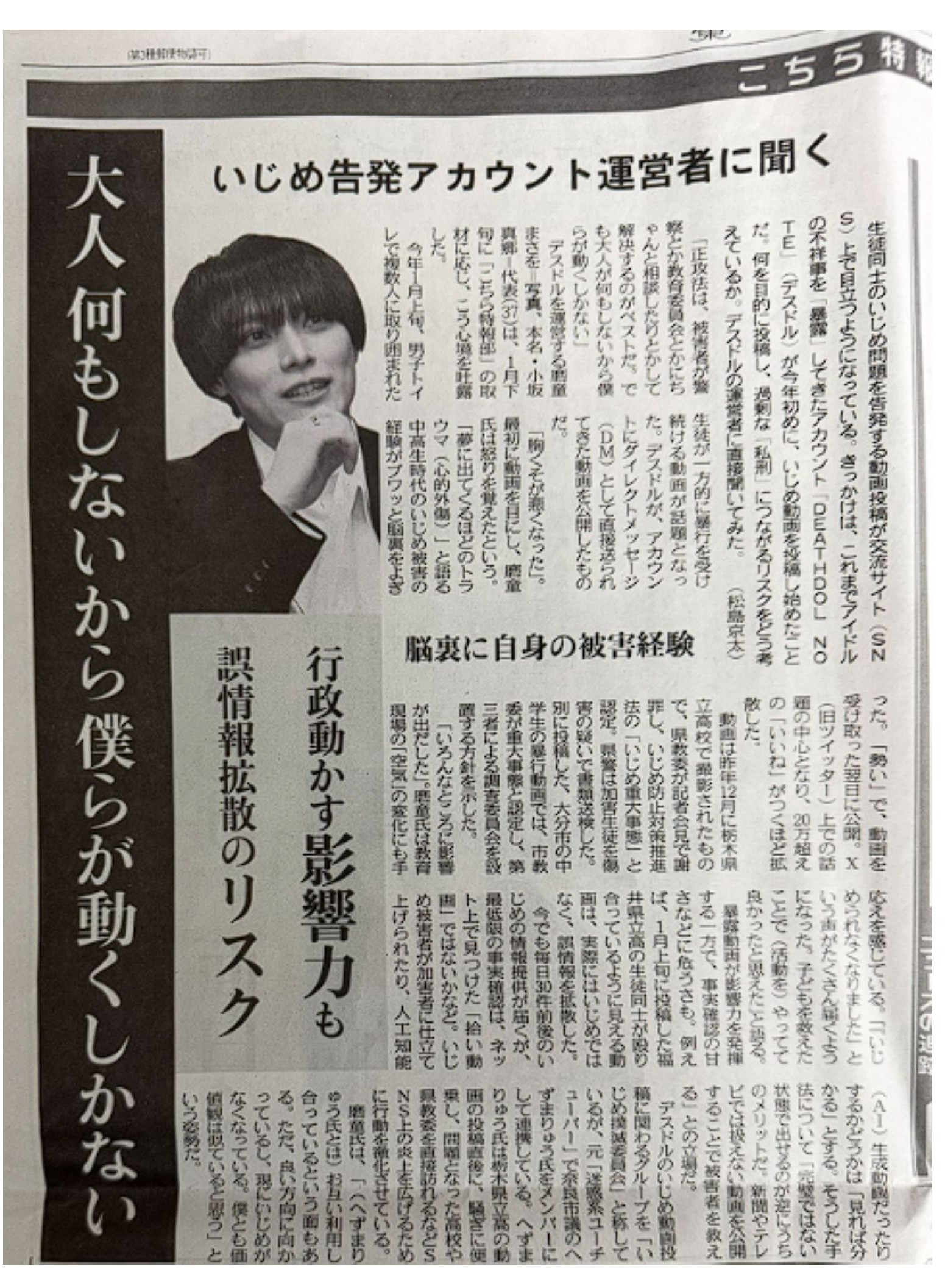 私が先月、東京にていじめ犯罪の調査ミッションを行ったが、東京新聞は、その先頭に立っている「磨童まさを君」の特集を行っている。