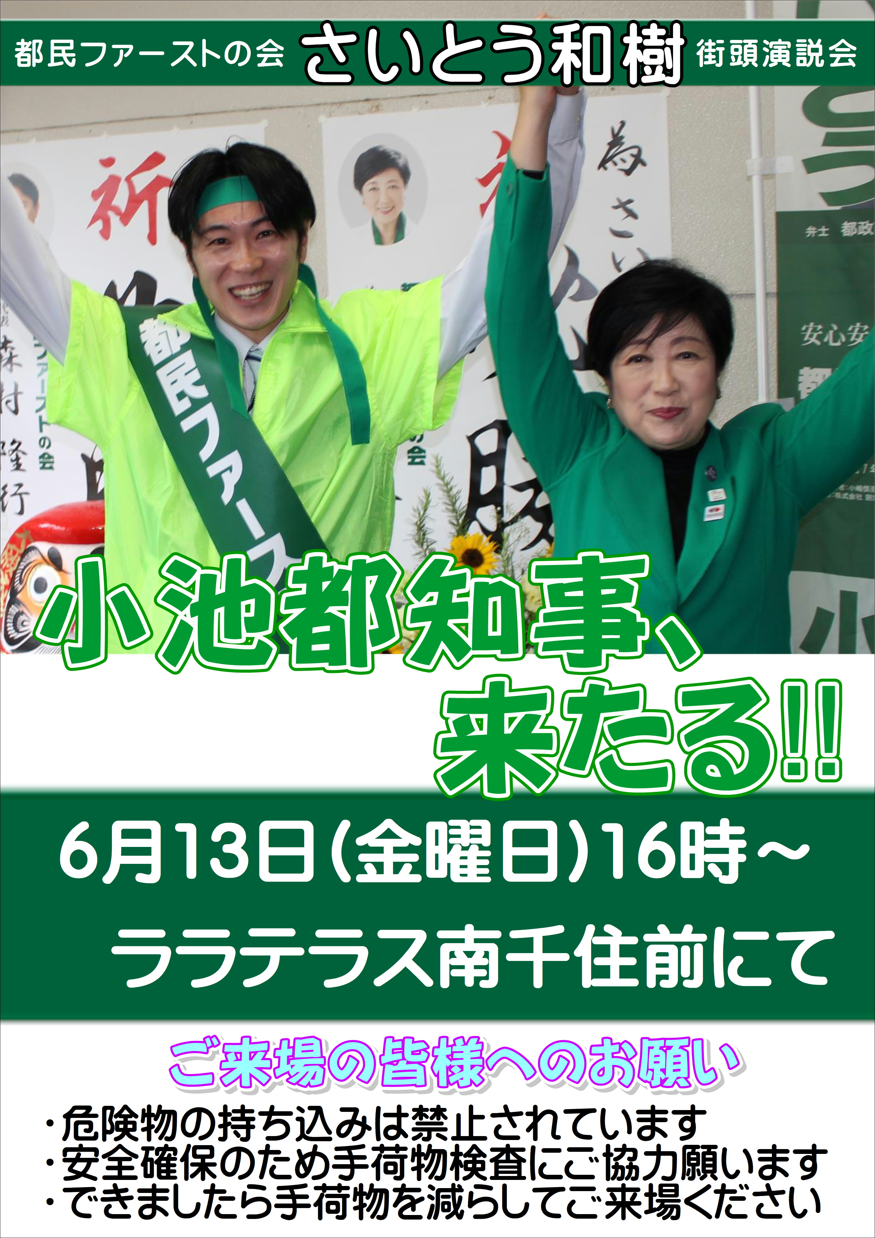 本日6月13日(金曜日)16時より、ララテラス南千住前にて第一声(出陣式)を開催致します。