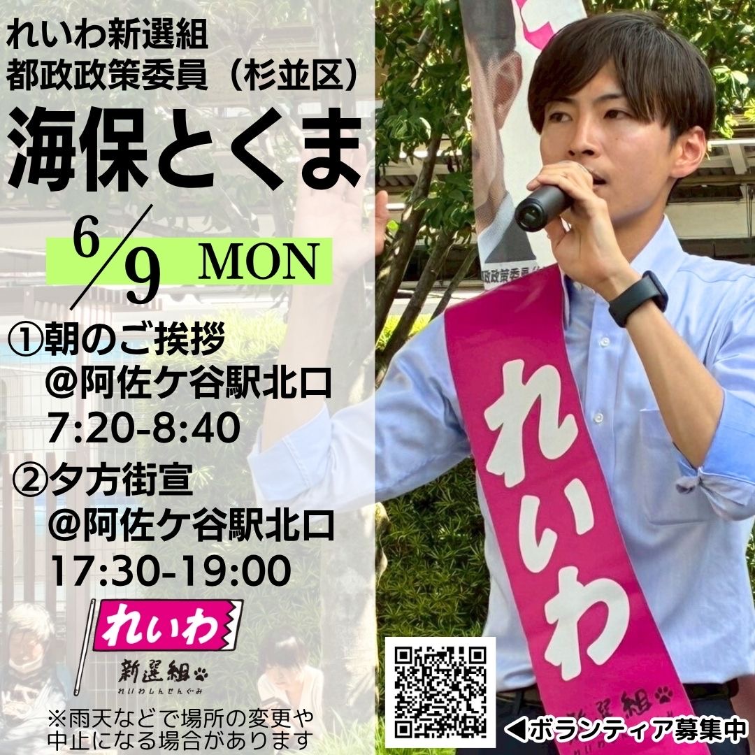 📢 6月9日(月) 活動情報 ①朝のご挨拶@阿佐ヶ谷駅北口 7:20-8:40 ②夕方街宣@阿佐ヶ谷駅北口 17:30-19:00