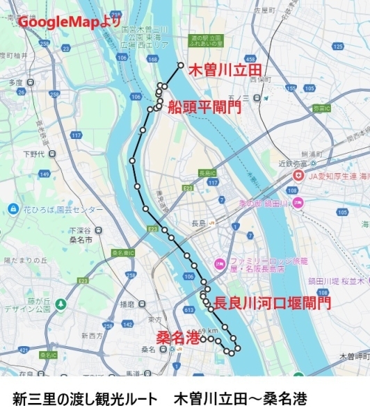 木曽川から船頭平閘門を通り、長良川へ入り長良川河口堰閘門を通り、揖斐川へ回り桑名港へ行くルートです。明治・平成の閘門を船からの体験ができます。