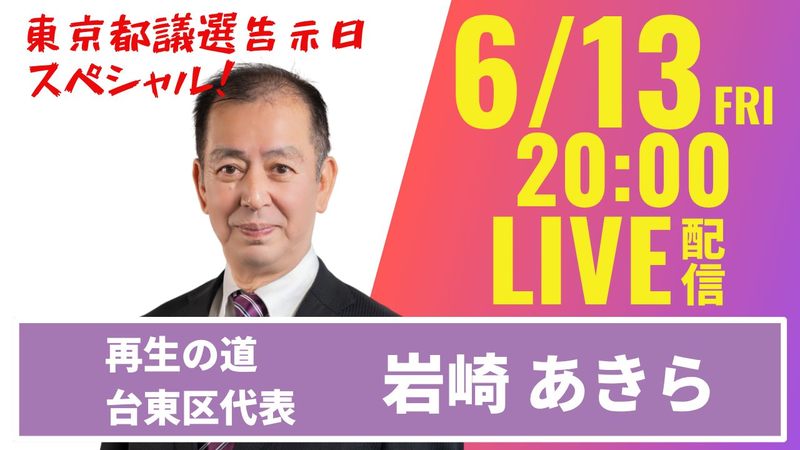 岩崎あきらです。 東京都議会議員選挙に地域政党「再生の道」から立候補いたしました。 皆様よろしくお願いいたします。 今夜は告示日スペシャルと題しまして、緊急LIVEを行います! ぜひご覧ください! https://youtube.com/live/BnHlM9OD5Fc?si=FyggF3gFk9iWe2uY