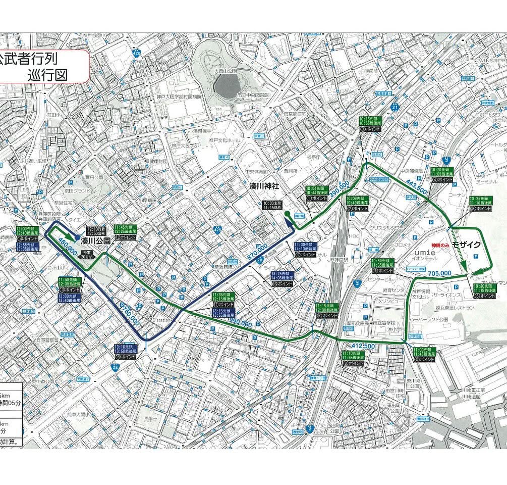 武者行列では甲冑の牙武者が黄金の神輿を先導し巡行するという明治7年から続く御幸神だ。同神社を出発して西元町からハーバーランドを経由して新開地を経て湊川公園を折り返すコースとなっている。