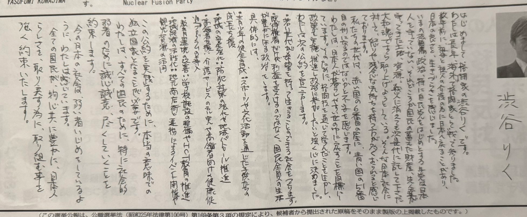 ホーム>政党・政治家>大隅 もとし (オオスミ モトシ)>渋谷りく 公約 (東京都選挙区 参議院議員候補)