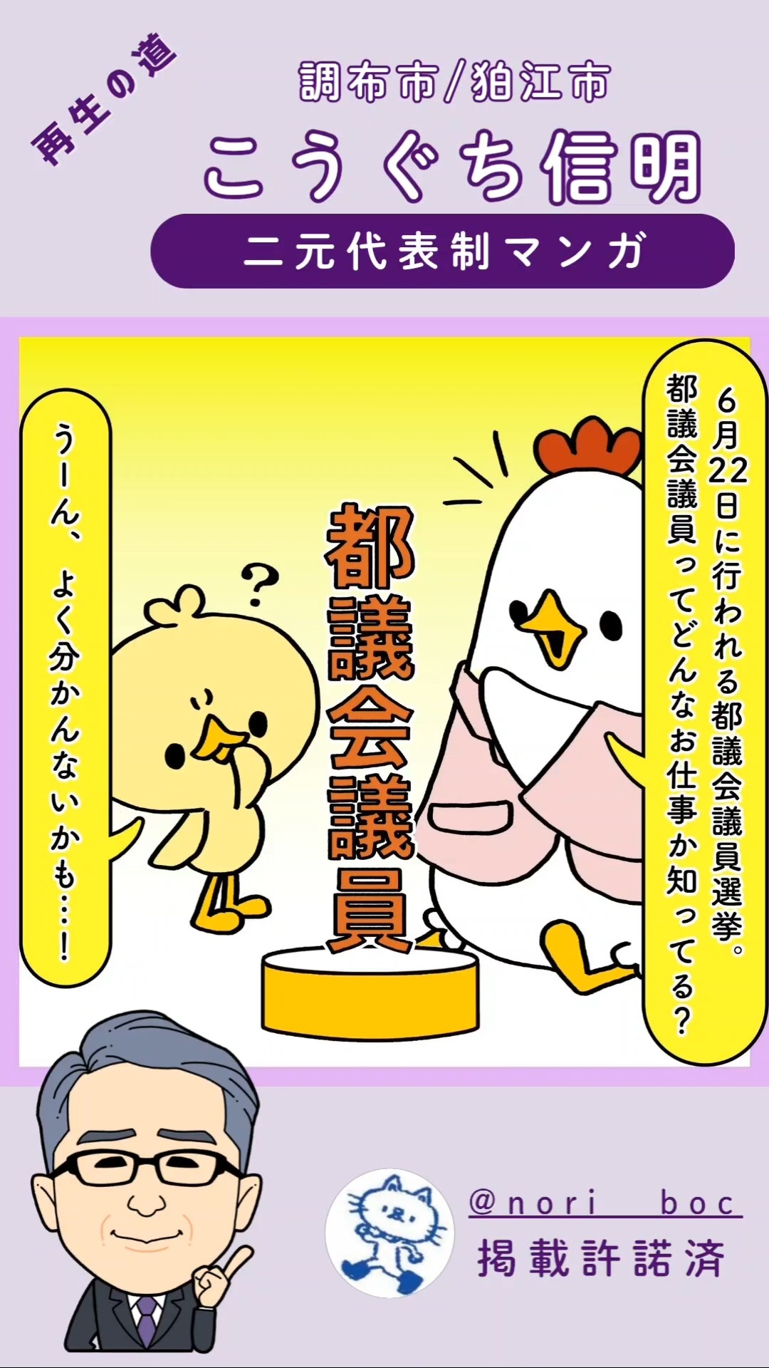 ビジネスマンと公務員、双方の経験を持つ私の30年のキャリアを活かし、無駄な予算が生まれる仕組みを明らかにします。都議会で必ずや結果を出す、こうぐち信明にご期待ください!