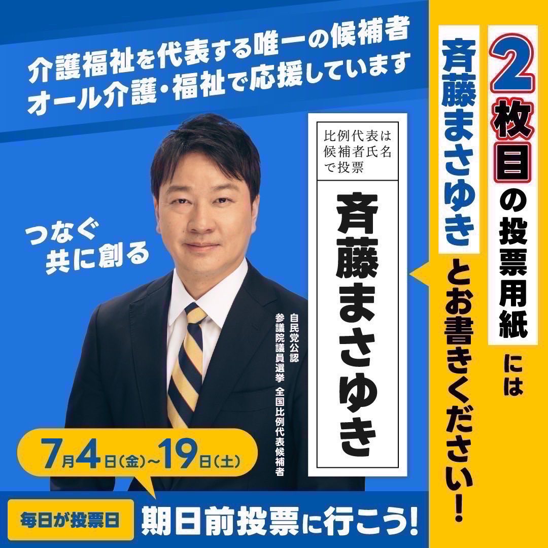 2枚目の投票用紙には必ず「斉藤まさゆき」とご記入いただき、最後までご支援をお願いいたします。