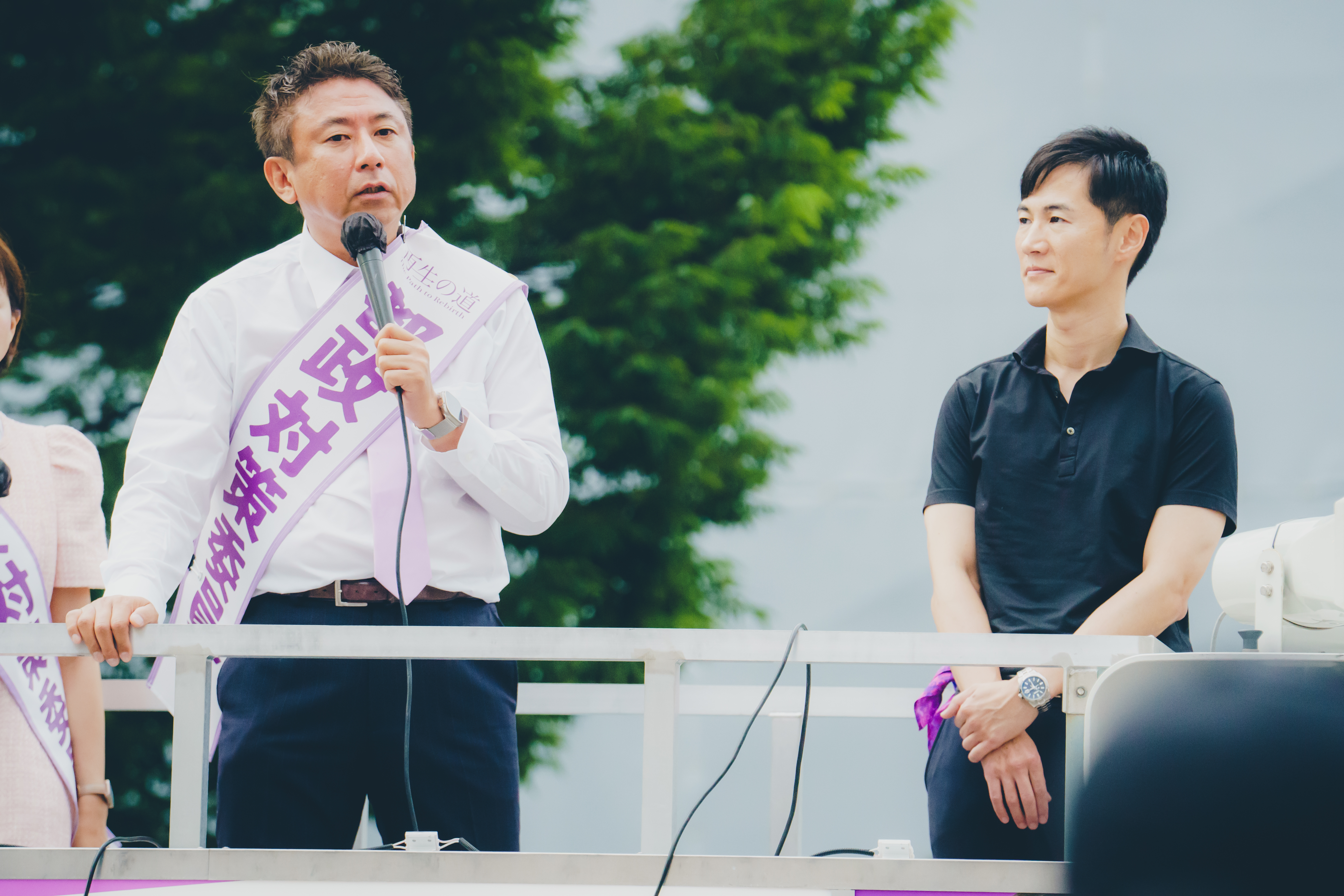 ホーム>政党・政治家>くれ よしつぐ (クレ ヨシツグ)>6/7 再生の道代表 石丸伸二との合同演説